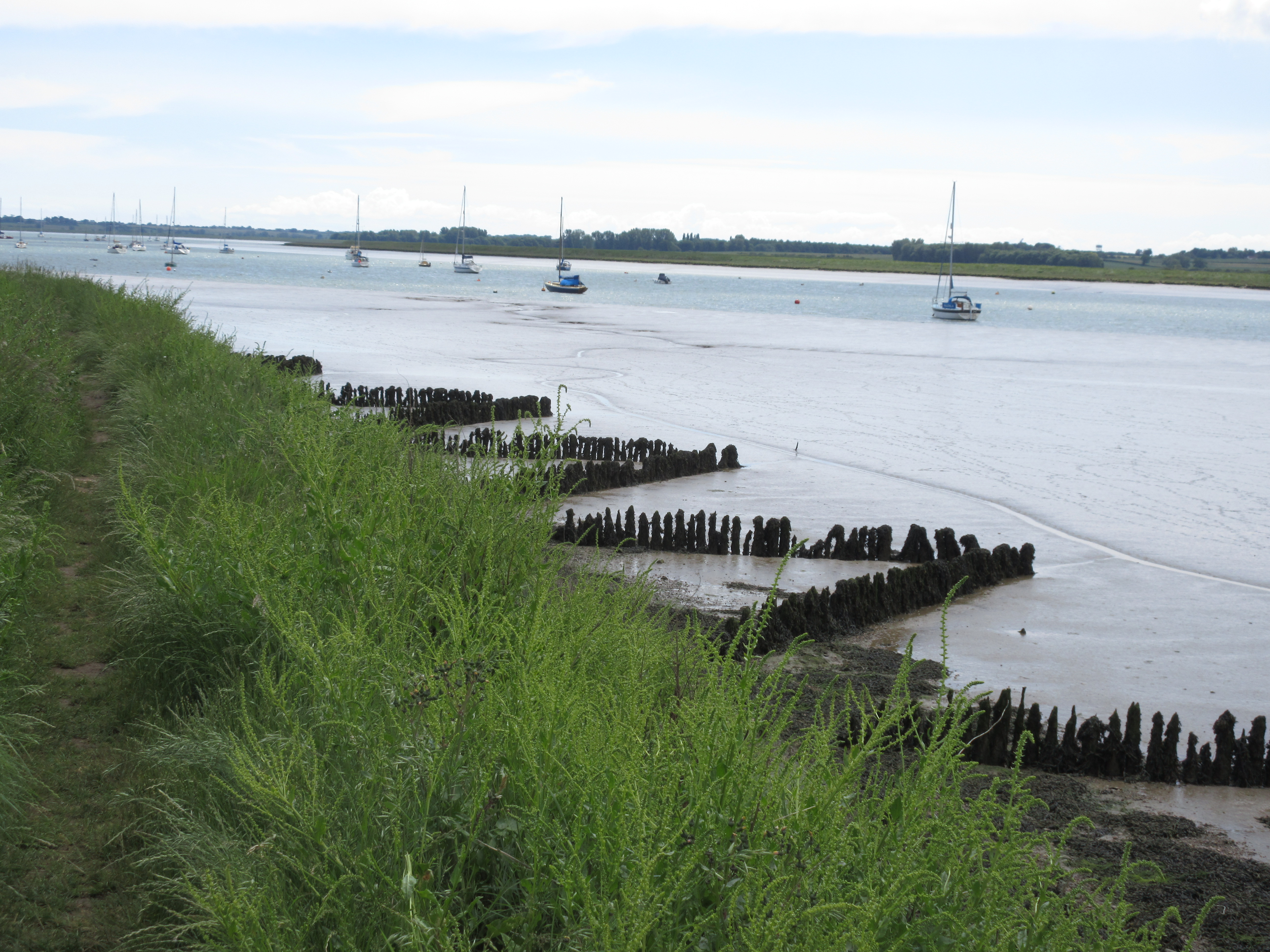 Just up river from the dock and below the wood, interestly named Craigpit Plantation, is a stretch of river which was a busy port in the 14th century when Edward III assembed his fleet to invade France. It is difficult to imagine as you look down from the wood because it is very quiet here. If you look at the flood map you can see an inlet at about this point which should have existed about that time and probably a good place for ship activity. If you carry on from this point towards the dock you get, what is to me, the best view of All Saints Church, up from the river wall.