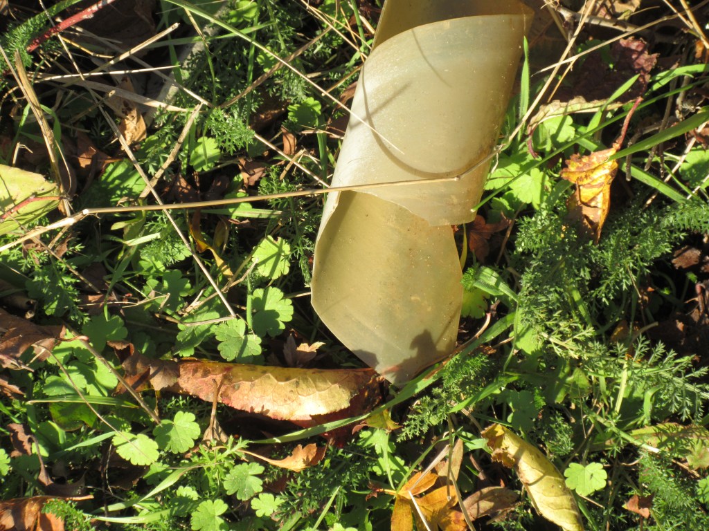 This shows a piece of plastic sleeve which had been used to wrap around the trunk of a young bush/tree and which had broken off. It was quite brittle so it easily broke again when I picked it up. It is plastic and we are near the sea. What do you think the likelihood of pieces of these sleeves ending up in the sea. I did not count the number of bush trunks that have these sleeves or similar wrapped around them but there are many. Quite a worry.