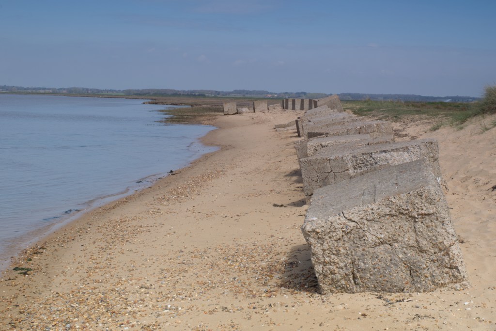 This area of the Peninsula was purpose-made for an invading army once you overcome the very marshy nature of some areas near the coast. The small number of roads and tracks would allow your heavy and light armoury to negotiate boggy bits to get to the wide-open fields and a small number of villages which without help would not have stood in the way of the invaders. Several cliffs would have reduced the entry points. If you were negotiating your landing craft up the estuary of River Deben, you would have the worrying ‘Deben Bar’ to negotiate. One of my books, ‘Up The Deben’ by Robert Simper, has a picture of the bar in a northeasterly with an ebb tide, and it is a vortex of angry water. However, once you are over the bar, you have plenty of beach landings with some hards and slipways. It occurred to the War Ministry or whoever that if we were going to repel the threatened invasion, it would be necessary to beef up the defences, and it would take some innovative creations. We are not talking Dad’s Army, although who would have thought decoys! Even Clive Dun’s upturned bath on pram wheels may have taken 2nd place to the crazy ideas. However, some of the defences were simple, like blocks of concrete along a beach, and some were more impressive, like the twin-gun emplacement at East Lane Bawdsey. If you can get a ‘A GUIDE TO SECOND WORLD WAS ARCHAEOLOGY IN SUFFOLK’ Guide 3: Orford to Felixstowe by Robert Liddiard and David Sims it has some interesting maps showing the defences in this area. Flame Fougasse, which is a type or bread, is also a pit filled with petrol and an explosive charge which projects onto your invading army. Frightning.