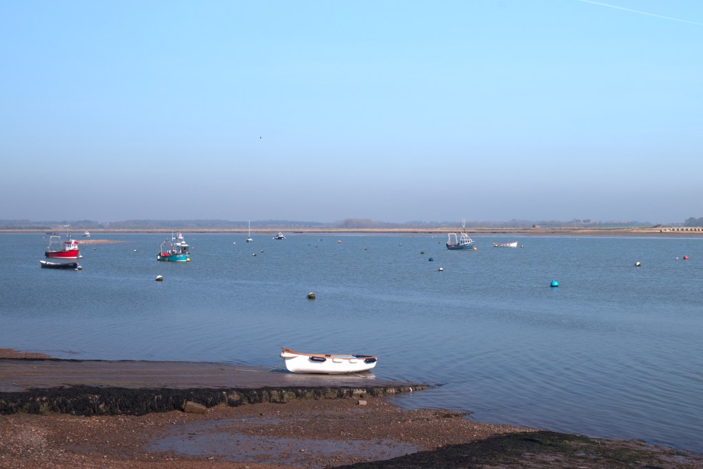 The row of houses next to the sandy beach are upstream from the quay itself. They must be quite desirable except that the view would be tainted in spring, summer and autumn by the row of campervans which park on the opposite side of the road. These are now discouraged by a set of very ugly and what look to be temporary red and white bollards set in the places where the campervans once parked. Aesthetically I prefer the campervans. The quay itself which is used by the foot ferry this side of the Deben few buildings now but does have tea house, the Boathouse Cafe, which serves very nice cakes. During the summer months you need to get there early because the quay and beach is very attractive to visitors. In the later autumn months, winter and early spring then it is quiet like the rest of the Peninsula.